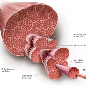 Iniziamo con il capire come è strutturato il nostro muscolo: è composto da numerose cellule, dette fibre muscolari, e da tessuto connettivo, entrambi ben organizzati. Le fibre muscolari sono cellule multinucleate, di forma allungata, lungo le quali si estendono miofibrille che a loro volta sono costituiti dai sarcomeri, ovvero le unità contrattili del muscolo. Il tessuto connettivo è composto da singole cellule, chiamate fibroblasti e ha la funzione di organizzare la struttura muscolare, di permettere lo scivolamento dei vari piani muscolari e di trasmettere la forza del muscolo alle ossa. Nel dettaglio possiamo trovare 3 livelli di tessuto connettivo: il primo, più interno, avvolgerà ogni singola fibra muscolare (endomisio); il secondo, avvolgerà più fibre muscolari, andando a formare dei fascicoli (epimisio); il terzo avvolgerà l’intero muscolo (perimisio).