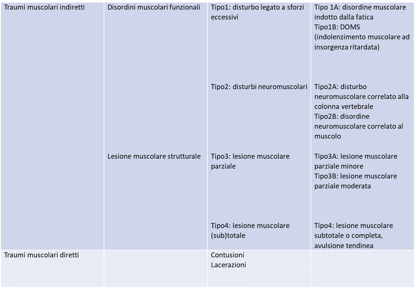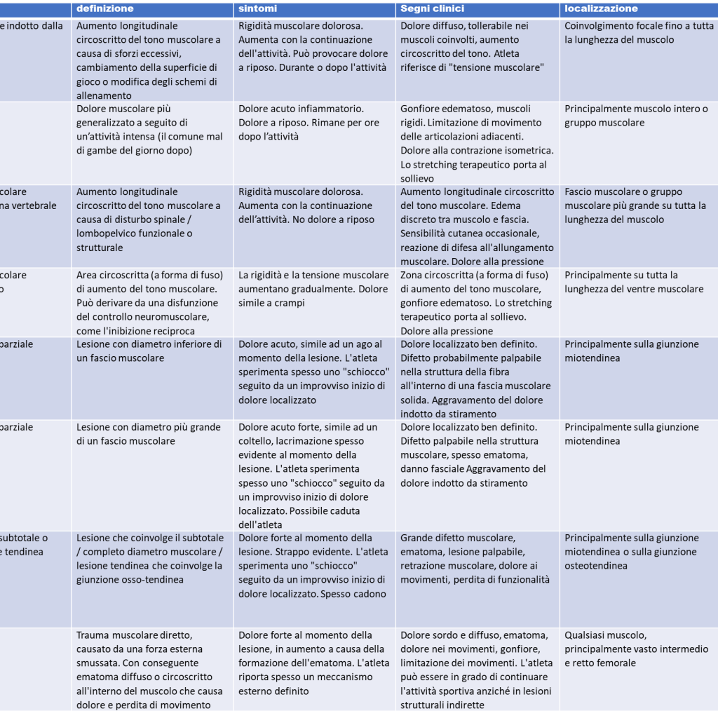 Nella seguente tabella è illustrato come ad ogni tipo di danno muscolare siano associati sintomi, segni clinici, localizzazione e risultati strumentali specifici che ci aiutano a comprenderne in maniera dettagliata le differenze e soprattutto a individuare più facilmente quello che rappresenta meglio il nostro caso.