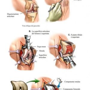 - Impianto delle parti metalliche rispettivamente una per la tibia e una per il femore, che andranno a costituire la nuova articolazione